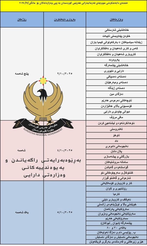 أعلنت وزارة المالية والاقتصاد في إقليم كردستان، اليوم الأربعاء (1 تشرين الأول 2025)، عن بدء عملية صرف رواتب موظفي الإقليم.