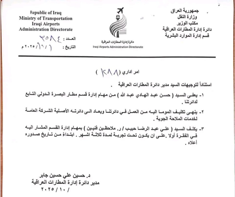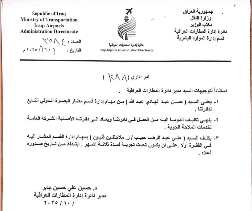 أظهرت وثيقة صادرة عن وزارة النقل، الأربعاء (1 تشرين الأول 2025)، إنهاء تكليف مدير قسم مطار البصرة الدولي حسن عبد الهادي عبد الله من مهامه، وإعادته إلى دائرته الأصلية في الشركة العامة لخدمات الملاحة الجوية.