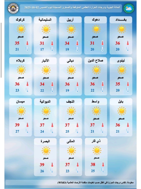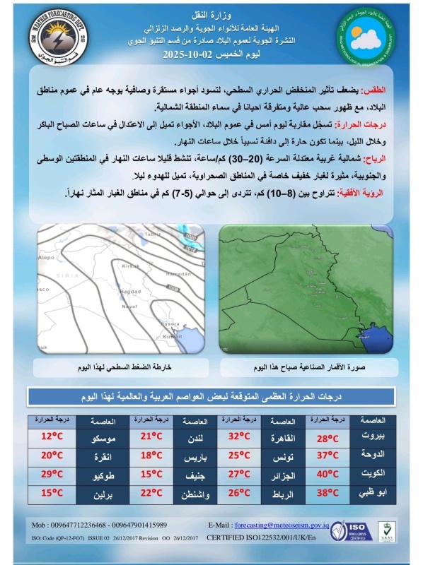 تشير توقعات الطقس، اليوم الخميس (2 تشرين الاول 2025)، إلى أن اجواء البلاد تكون مستقرة وصافية بوجه عام في عموم مناطق البلاد بسبب ضعف تأثير المنخفض الحراري السطحي، فيما تستقر درجات الحرارة، حيث تميل الاجواء الى الاعتدال في ساعات الصباح الباكر وخلال الليل، وتكون حارة إلى دافئة نسبياً خلال ساعات النهار.