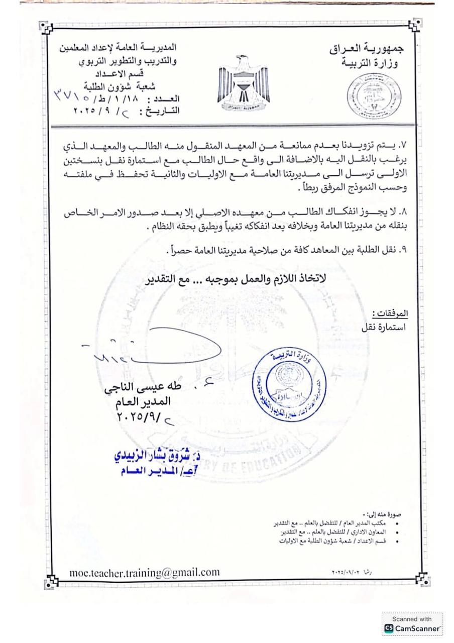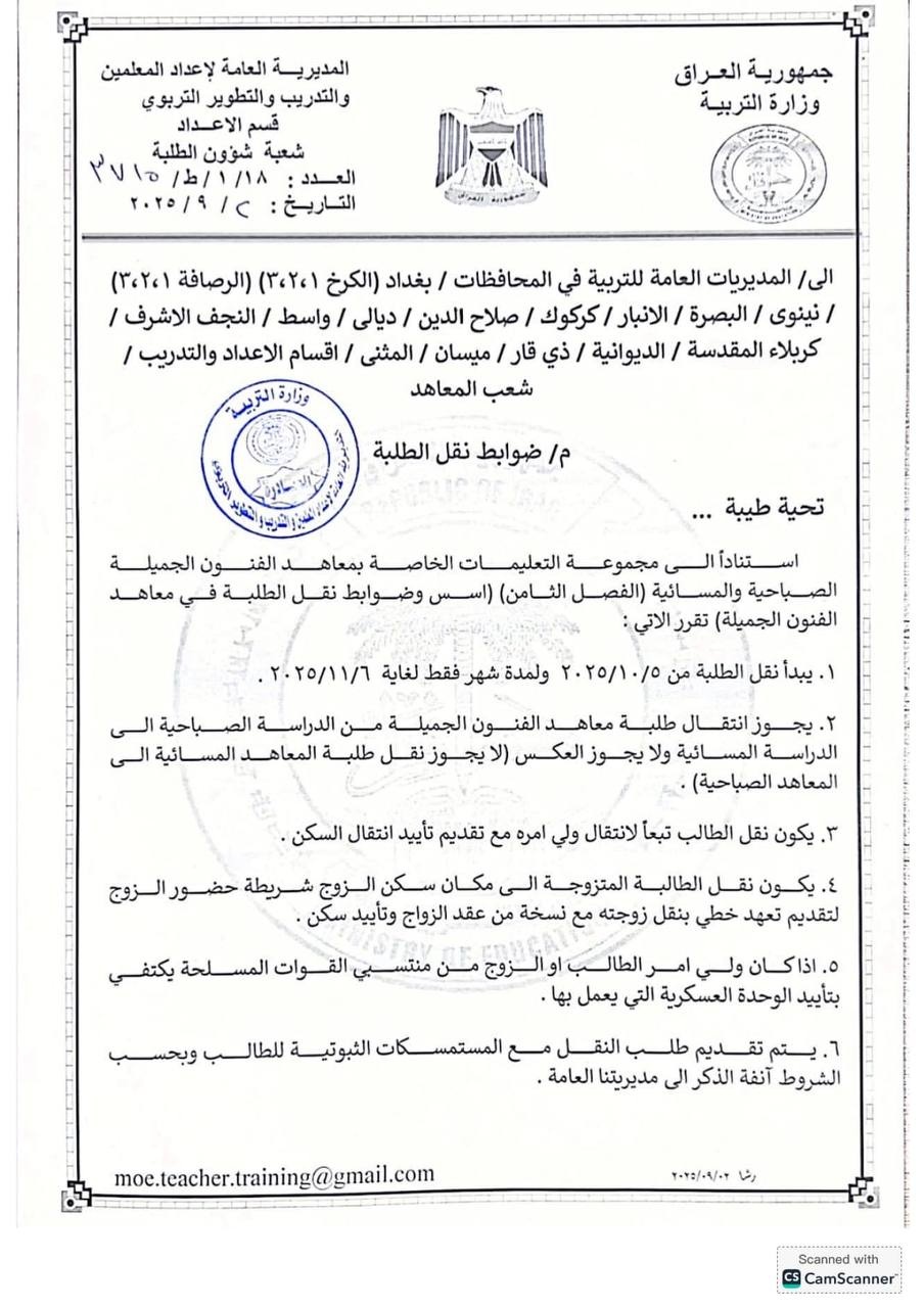 وأشار البيان إلى أن "نقل الطلبة بين المعاهد كافة يتم عبر المديرية العامة لإعداد المعلمين والتدريب والتطوير التربوي حصراً، ويكون بتقديم طلب النقل مع المستمسكات الثبوتية إلى المديرية العامة فقط".