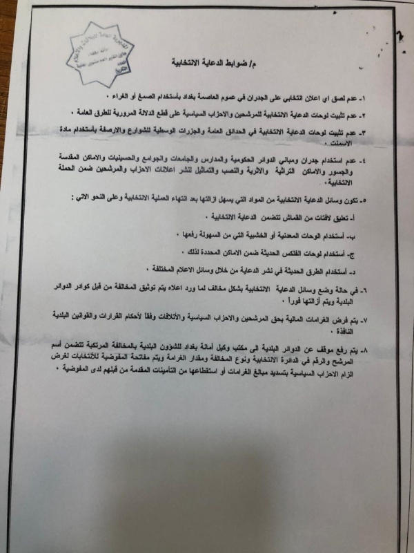 وبحسب الوثائق ادناه والتي وردت لـ"بغداد اليوم"، فأن المفوضية اصدرت 8 ضوابط الدعاية الانتخابية الخاصة بالمرشحين: