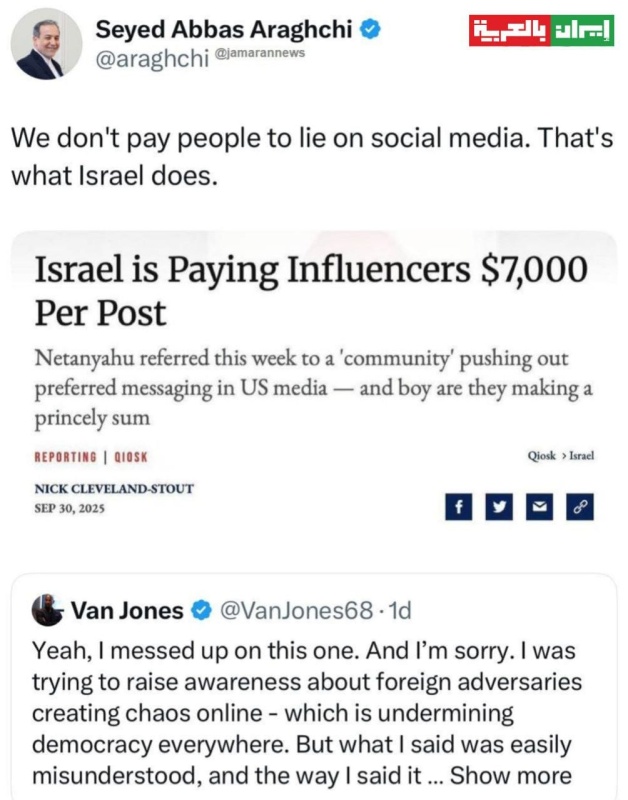أكد وزير الخارجية الإيراني عباس عراقجي، اليوم الاثنين (6 تشرين الأول 2025)، أن إيران لا تدفع لأحد من أجل نشر الأكاذيب على مواقع التواصل الاجتماعي، مشيرًا إلى أن هذه المهمة تُنسب لإسرائيل.