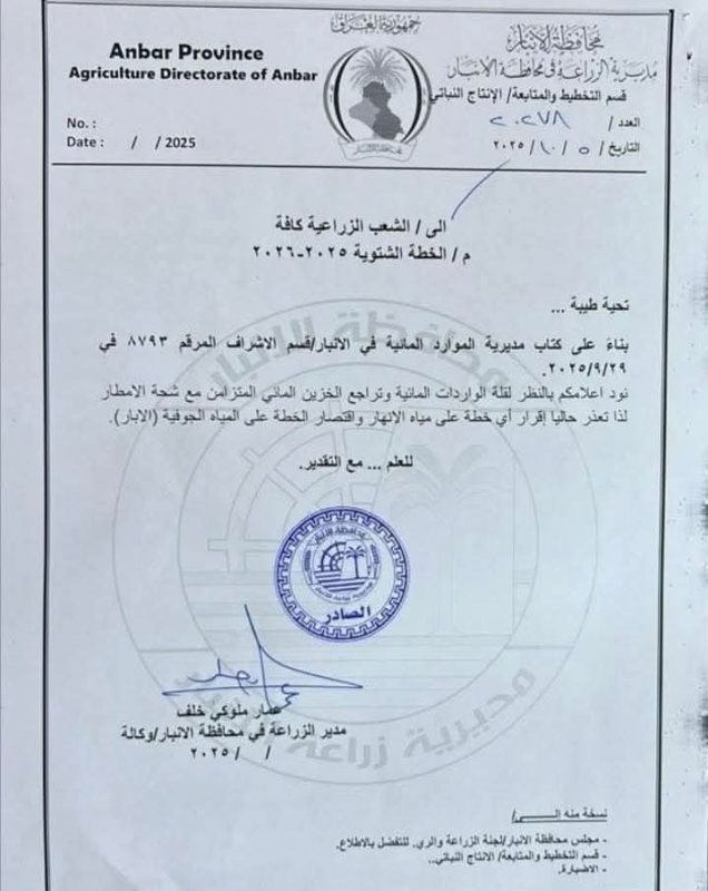 كشفت وثيقة صادرة عن مديرية زراعة الأنبار، أن الموسم الزراعي الحالي لن يشمل إقرار الخطة الزراعية للمزارعين الذين يعتمدون على مياه الأنهر في سقي محاصيلهم.