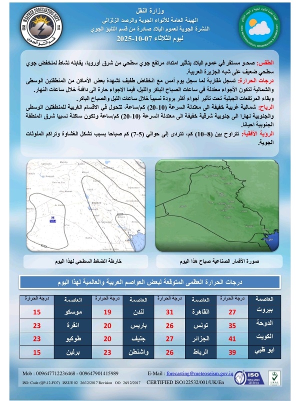 تشير توقعات الطقس، اليوم الثلاثاء (7 تشرين الاول 2025)، الى استمرار حالة الاستقرار الجوي في عموم البلاد، مع ارتفاع طفيف في درجات الحرارة خلال الساعات المقبلة متأثرة بامتداد مرتفع جوي سطحي لتكون الأجواء معتدلة في ساعات الصباح الباكر والليل، فيما تكون حارة الى دافئة خلال ساعات النهار.