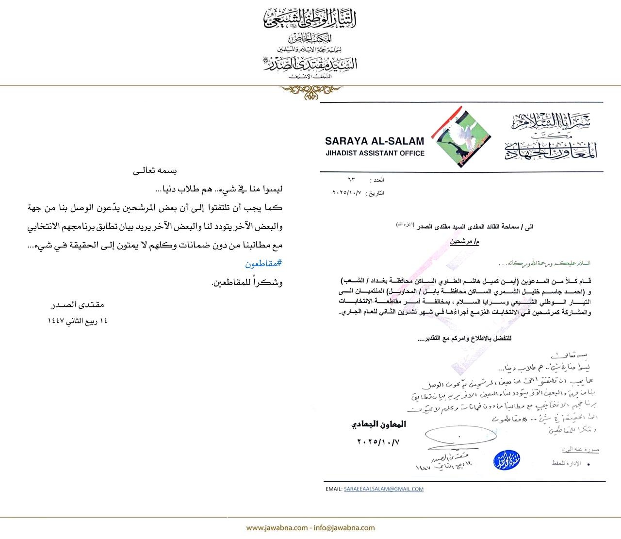 وشدد الصدر على ضرورة الانتباه إلى استغلال اسمه أو اسم التيار في الدعاية الانتخابية، موجهاً تحذيراً لأتباعه: "كما يجب أن تلتفتوا إلى أن بعض المرشحين يدّعون الوصل بنا من جهة والبعض الآخر يتودد لنا والبعض الآخر يريد بيان تطابق برنامجهم الانتخابي مع مطالبنا من دون ضمانات، وكلهم لا يمتون إلـى الحقيقة فـي شيء... #مقاطعون. وشكراً للمقاطعين".