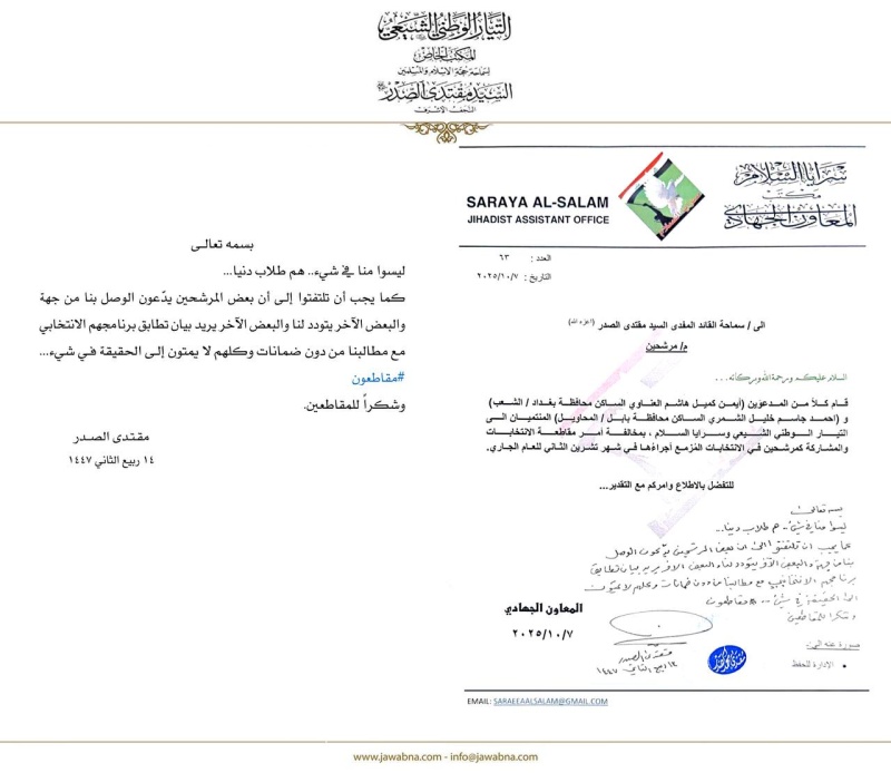 اطلع زعيم التيار الوطني الشيعي مقتدى الصدر، اليوم الثلاثاء (7 تشرين الأول 2025)، على نشاط سرايا السلام، الذي تضمن أسماء أشخاص ينتمون إلى التيار الشيعي الوطني لكنهم خالفوا قرار المقاطعة وقاموا بالترشيح للانتخابات.