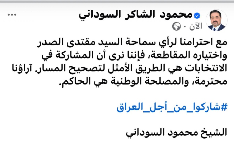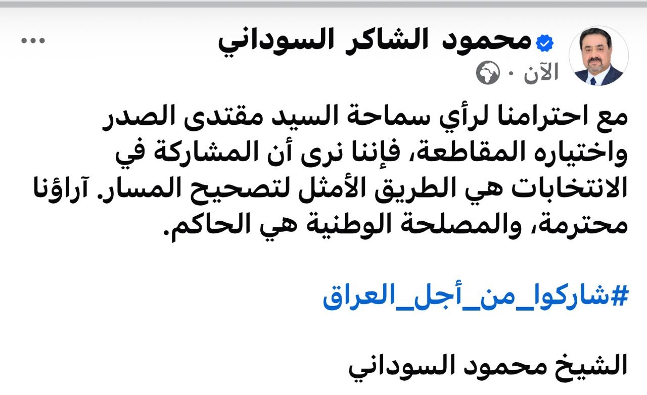 وتأتي تصريحات السوداني بعد إعلان زعيم التيار الوطني الشيعي مقتدى الصدر مقاطعة الانتخابات المقبلة، في خطوة أثارت جدلاً واسعاً داخل الساحة السياسية، إذ يرى الصدر أن العملية الانتخابية فقدت جدواها في ظل ما وصفه بسيطرة "الفساد والسلاح المنفلت"، فيما تدعو أطراف سياسية أخرى إلى المشاركة باعتبارها الطريق الوحيد للتغيير من داخل العملية الديمقراطية.
