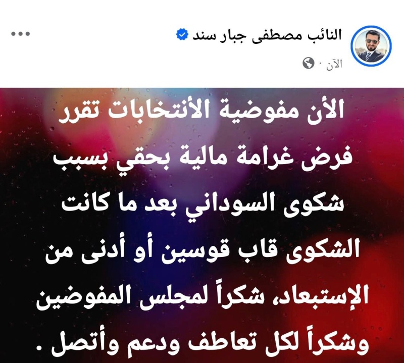 وفي المقابل، نشر النائب مصطفى سند عبر صفحته الرسمية بياناً قال فيه إن "مفوضية الانتخابات قررت فرض غرامة مالية بحقه على خلفية شكوى تقدم بها رئيس الوزراء محمد شياع السوداني"، موضحاً أن "الإجراء اقتصر على الغرامة دون الاستبعاد"، موجهاً الشكر إلى مجلس المفوضين لدعمهم، ومؤكداً استمراره في السباق الانتخابي.