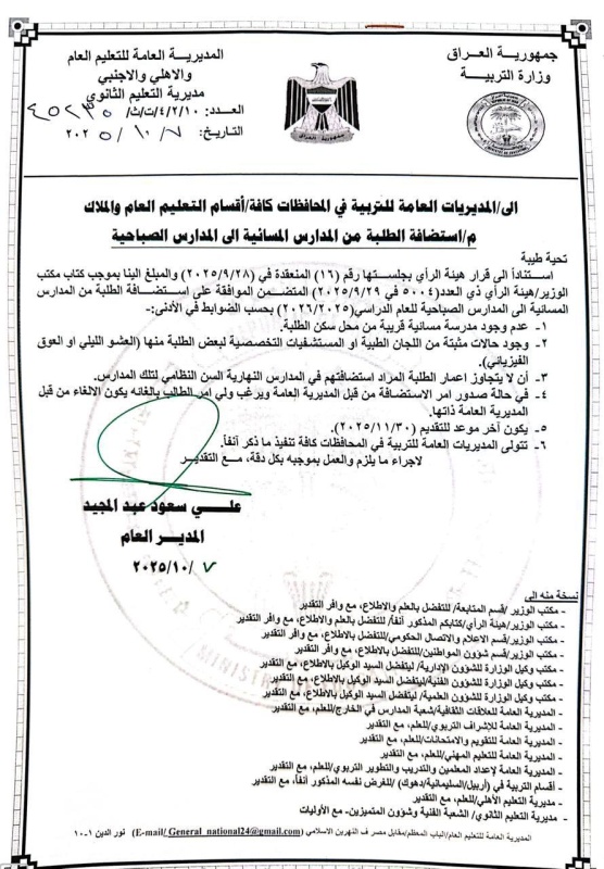 أعلنت وزارة التربية / المديرية العامة للتعليم العام والأهلي والأجنبي، اليوم الثلاثاء (7 تشرين الأول 2025)، فتح باب استضافة الطلبة من المدارس المسائية إلى المدارس الصباحية للعام الدراسي (2025-2026)