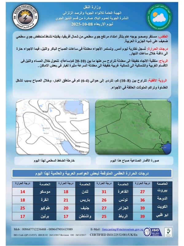 تشير توقعات الطقس، اليوم الأربعاء (8 تشرين الاول 2025)، الى أن أجواء البلاد تكون صحوة ومستقرة بوجه عام بتأثير امتداد مرتفع جوي سطحي من شمال أفريقيا، بينما تسجل درجات الحرارة مُقاربة ليوم أمس لتكون الاجواء معتدلة في الصباح الباكر والليل، فيما تكون دافئة خلال ساعات النهار.