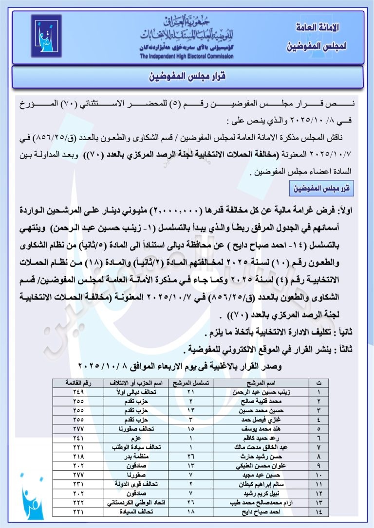 وفي القرار الآخر لمجلس المفوضين "فقد فرض غرامة مالية مقدارها مليونان دينار على (14) مرشحاً في محافظة ديالى، وذلك لمخالفتهم لائحة النظام (18) من نظام الحملات الانتخابية رقم (4) لسنة 2023".