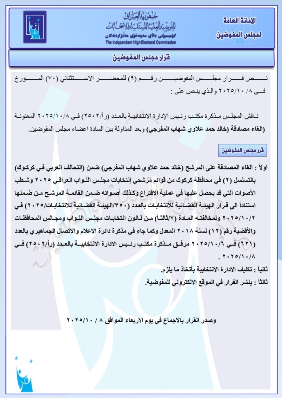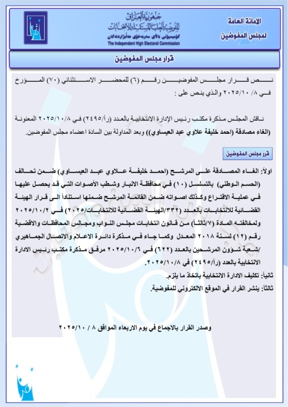أصدر مجلس المفوضين في المفوضية العليا المستقلة للانتخابات، اليوم الأربعاء (8 تشرين الأول 2025)، ثلاثة قرارات شملت إلغاء المصادقة على مرشحين وفرض غرامات مالية على آخرين في محافظات الأنبار وديالى وكركوك.