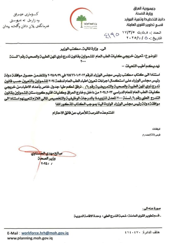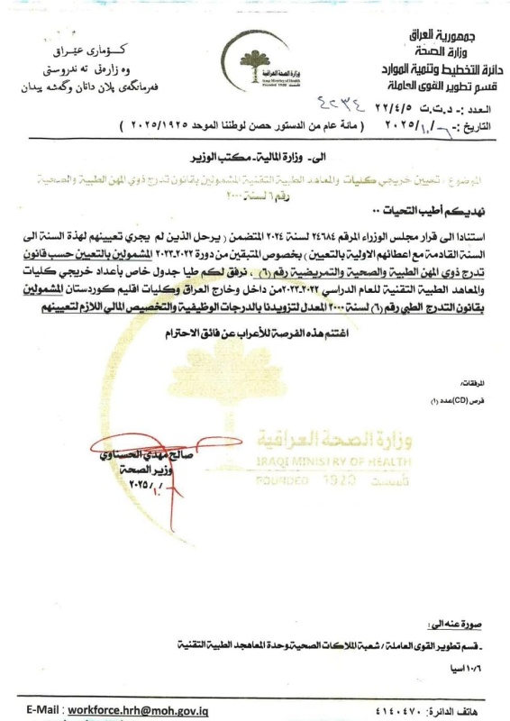 وبحسب كتاب للصحة، الذي حصلت عليه "بغداد اليوم"، اليوم الأربعاء، (8 تشرين الأول 2025)، فأن "مخاطبة وزارة المالية جاءت لغرض تنفيذ قرار مجلس الوزراء بشأن تعيين خريجي كليات الطب العام والكليات والمعاهد الطبية والتقنية المشمولين بـقانون تدرج ذوي المهن الطبية والصحية رقم (6) لسنة 2000".
