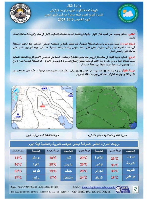 تشير توقعات الطقس، اليوم الخميس (9 تشرين الاول 2025)، الى أن أجواء البلاد تكون مستقرة وصحوة على العموم خلال النهار، فيما تنخفض درجات الحرارة قليلا في المنطقتين الوسطى والشمالية. لتكون الأجواء معتدلة في ساعات الصباح الباكر والليل، تميل الى الدفئ خلال ساعات النهار وباردة في المناطق الشمالية.