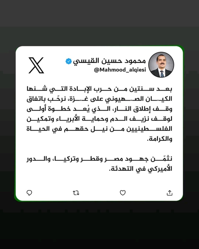 رحّب رئيس تحالف العزم في بغداد محمود حسين القيسي، اليوم الخميس (9 تشرين الأول 2025)، بوقف إطلاق النار في قطاع غزة، واصفاً الاتفاق بأنه خطوة أولى لوقف نزيف الدم وحماية المدنيين وتمكين الفلسطينيين من نيل حقهم في الحياة والكرامة.
