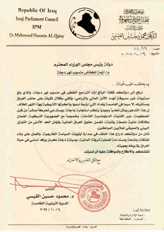 وجه عضو مجلس النواب محمود حسين القيسي، اليوم الخميس (9 تشرين الأول 2025)، كتاباً رسمياً إلى رئيس مجلس الوزراء محمد شياع السوداني، بعد التراجع الخطير في مناسيب نهر دجلة، واعتبره تهديداً مباشراً للأمن المائي والغذائي والبيئي في البلاد، داعياً إلى إدراج الملف ضمن أولويات السياسة الخارجية العراقية لضمان حقوق العراق المائية من دول الجوار.