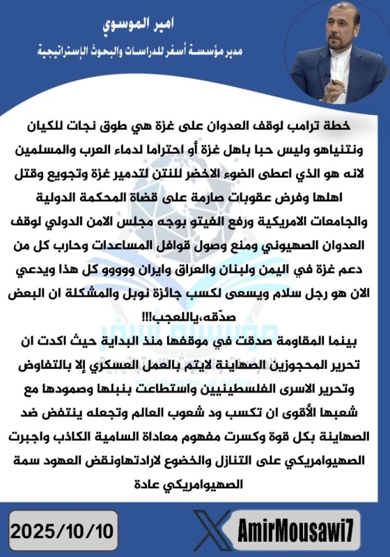 اتهم مدير مؤسسة أسفر للدراسات والبحوث الاستراتيجية، أمير الموسوي، اليوم الجمعة (10 تشرين الأول 2025)، الرئيس الأمريكي دونالد ترامب بمحاولة إنقاذ "الكيان الإسرائيلي" عبر خطته المعلنة لوقف العدوان على غزة، مؤكدًا أن ما يطرحه ترامب "ليس حبًا بغزة أو احترامًا للدماء العربية"، بل سعيًا لمنح الضوء الأخضر لتل أبيب لتدمير القطاع.