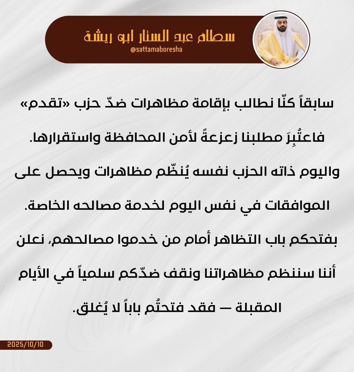 وقال أبو ريشة في منشور على حسابه بمنصة “إكس”، تابعته "بغداد اليوم"، إن “حزب تقدم الذي اعتبر في وقت سابق أن الدعوات إلى التظاهر تُزعزع أمن المحافظة واستقرارها، أصبح اليوم هو من ينظم التظاهرات ويطلب الموافقات الرسمية لخدمة مصالحه الخاصة”.