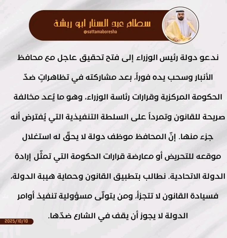 دعا الشيخ سطام عبد الستار أبو ريشة، اليوم الجمعة (10 تشرين الأول 2025)، رئيس مجلس الوزراء، محمد شياع السوداني، بفتح تحقيق عاجل مع محافظ الأنبار وسحب يده فوراً.