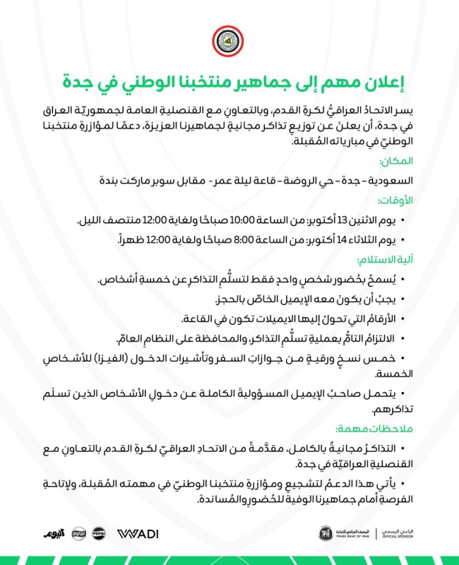 وأوضح، ان "التذاكر مجانية بالكامل ومقدمة منه بالتعاون مع القنصلية العراقية في جدة ويأتي هذا الدعم لتشجيع ومؤازرة المنتخب الوطني في مهمته المقبلة ولإتاحة الفرصة امام الجماهير الوفية للحضور والمساندة".