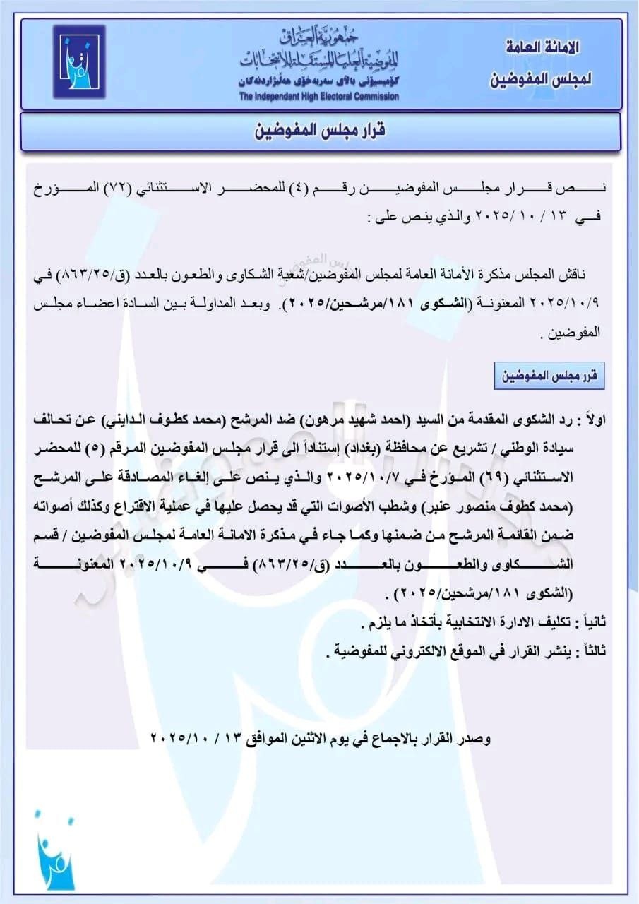 قررت مفوضية الانتخابات ، اليوم الاثنين (13 تشرين الأول 2025)، إعادة مرشح محافظة بغداد عن تحالف السيادة الوطني – تشريع، محمد الدايني، إلى السباق الانتخابي لإنتخابات مجلس النواب العراقي المقرر إجراؤها في 11 تشرين الثاني 2025.