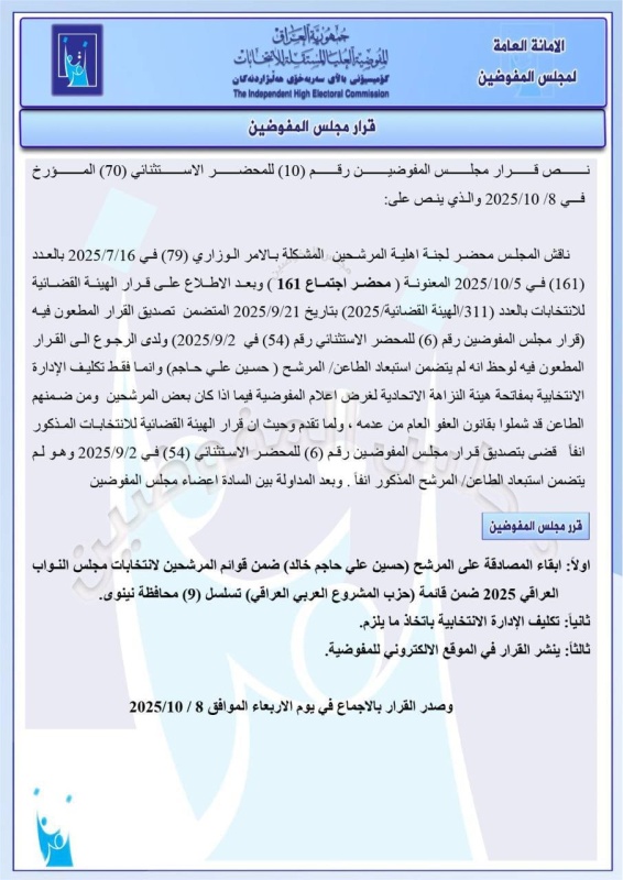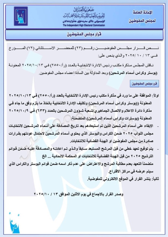 أصدرت مفوضية الانتخابات، قرارات جديدة، تتضمن الموافقة على الإبقاء على أسماء المرشحين الذين تم استبعادهم ضمن "الكراس والبوستر"، لاحتمال عودتهم بقرارات صادرة من مجلس المفوضين أو الهيئة القضائية للانتخابات.