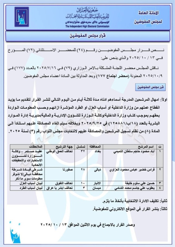 وفي قرار آخر أمهلت مفوضية الانتخابات مرشحين من وزارة الداخلية ثلاثة أيام لتقديم ما يثبت انقطاع عملهم من الوزارة أو أسباب العزل أو الطرد المؤشرة إزاءهم" محذرة، من "أنه بخلاف ذلك سيتم إلغاء المصادقة".