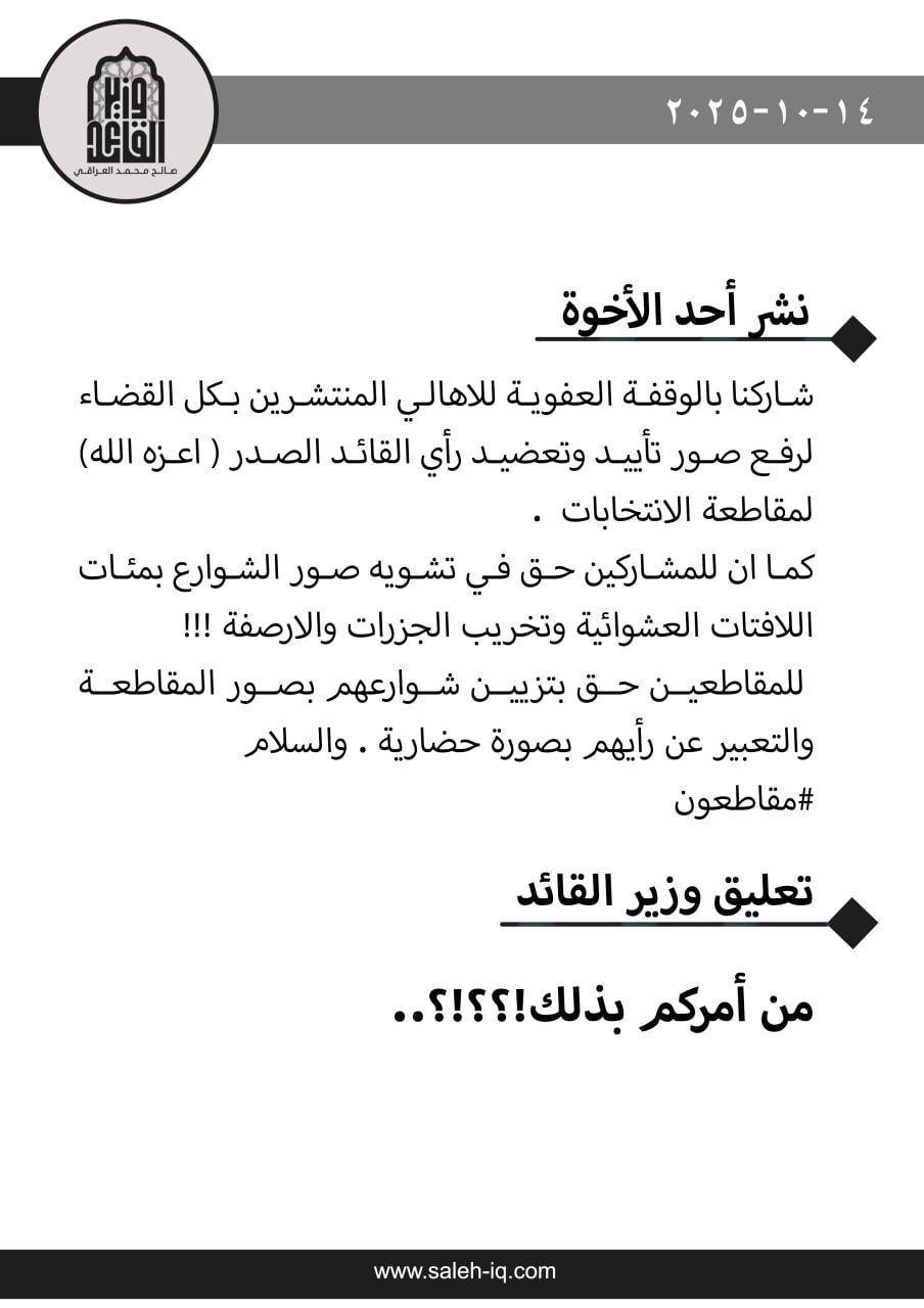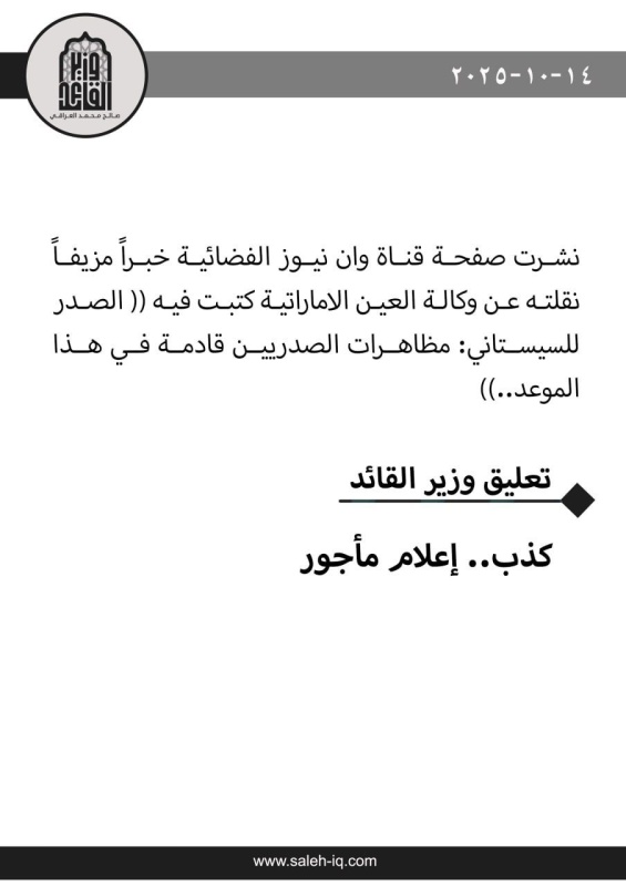 نفى صالح محمد العراقي وزير زعيم التيار الوطني الشيعي، مقتدى الصدر، اليوم الثلاثاء، (14 تشرين الأول 2025)، الأنباء عن نية الصدر بالدعوة لأنصاره بالتظاهر نهاية الشهر الجاري.