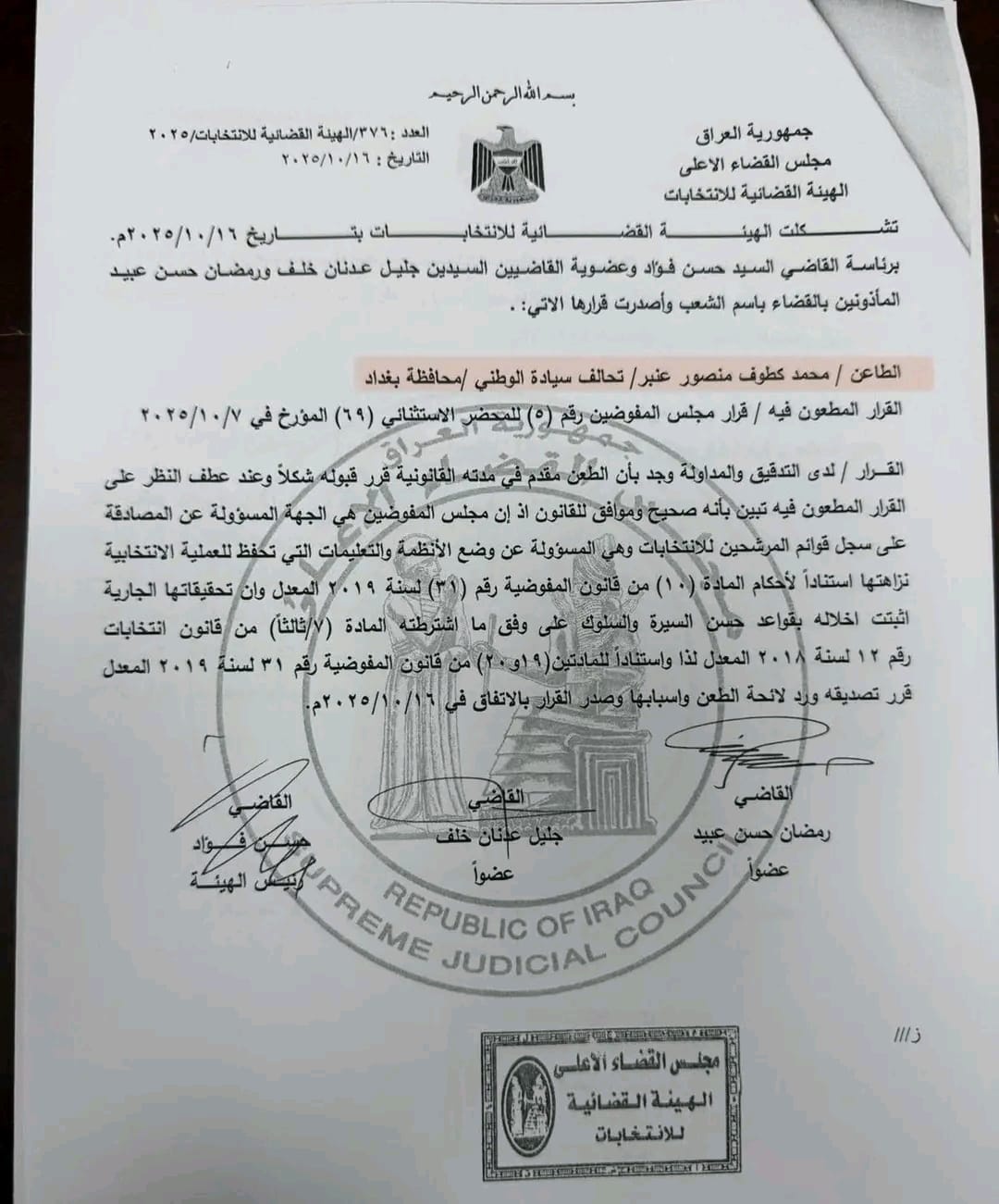وبحسب وثيقة وردت لـ"بغداد اليوم"، فأن مجلس القضاء الاعلى قرر ان القرار المطعون فيه بشأن استبعاد الدايني عن السباق الانتخابي صحيح وموافق للقانون:
