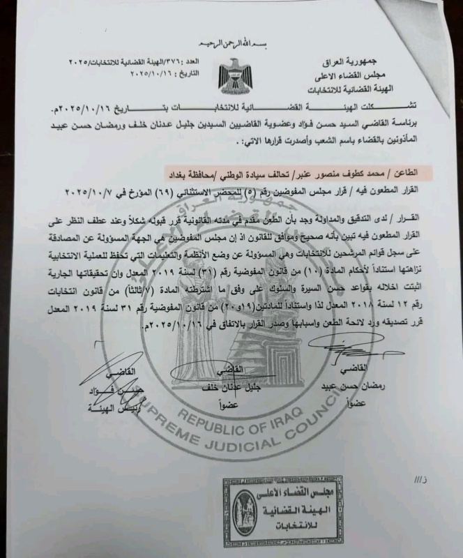 أعلنت المفوضية العليا المستقلة للانتخابات، اليوم الخميس (16 تشرين الاول 2025)، عن رفضها اعادة مرشح محافظة بغداد عن تحالف السيادة الوطني، محمد الدايني للانتخابات.