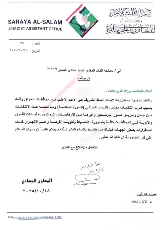 وجه زعيم التيار الوطني الشيعي، مقتدى الصدر، اليوم السبت (18 تشرين الأول 2025)، سرايا السلام بالانضباط، وعدم الانجرار خلف "الاستفزازات الانتخابية".
