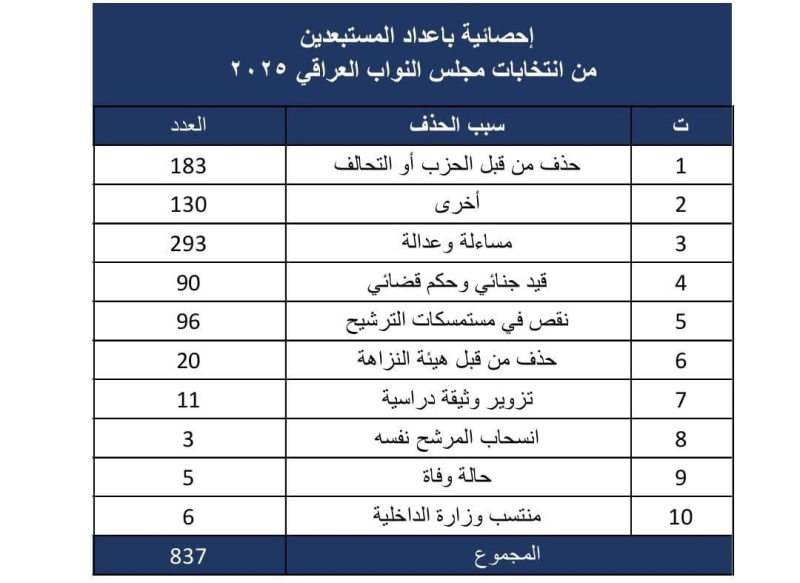 أعلنت المفوضية العليا المستقلة للانتخابات، اليوم السبت (18 تشرين الأول 2025)، إحصائية بعدد المستبعدين من انتخابات مجلس النواب العراقي لعام 2025، مبينة أن عددهم بلغ 837 مرشحًا لأسباب مختلفة، بينها المساءلة والعدالة، وقرارات قضائية، ونقص في مستمسكات الترشيح، وحذف من قبل الأحزاب أو التحالفات، وكما هو موضح أدناه: