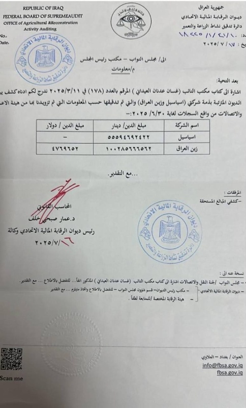 وأظهرت الوثيقة تفصيلاً للمبالغ المترتبة بذمة الشركتين الرئيسيتين، حيث بلغت الديون المترتبة على شركة آسيا سيل مبلغ 55 ملياراً و594 مليوناً و692 ألفاً و422 ديناراً عراقياً.