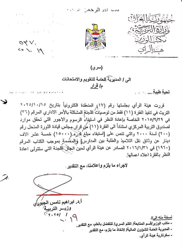 وذكر قرار صادر عن وزير التربية، تلقته "بغداد اليوم"، أن "هيئة الرأي قررت التريث في تنفيذ الفقرة (11) فقط من توصيات اللجنة المشكلة بخصوص إعادة النظر في استيفاء الرسوم والأجور التي تحقق موارد لصندوق التربية المركزي وتقدر بـ 15 ألف دينار عن وثائق نقل التلاميذ والطلبة بين المدارس".