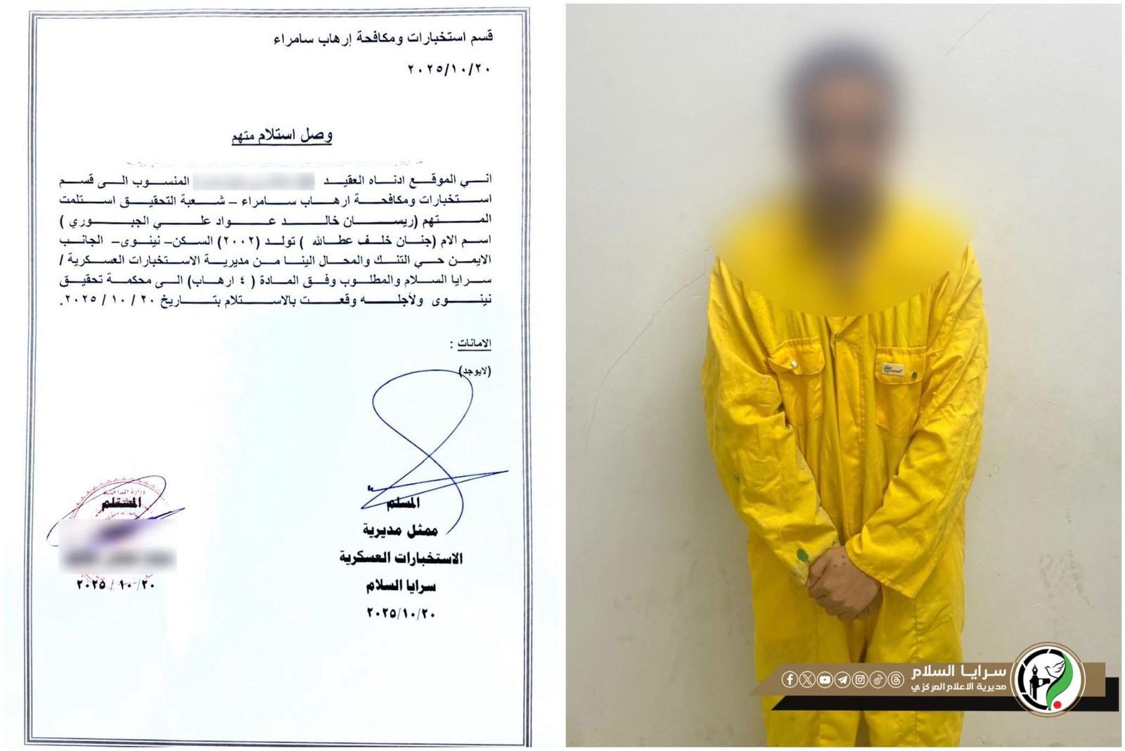 أعلنت سرايا السلام، اليوم الاثنين (20 تشرين الأول 2025)، عن إلقاء القبض على المتهم ريسان خالد عواد الجبوري المطلوب وفق أحكام المادة (4 إرهاب).