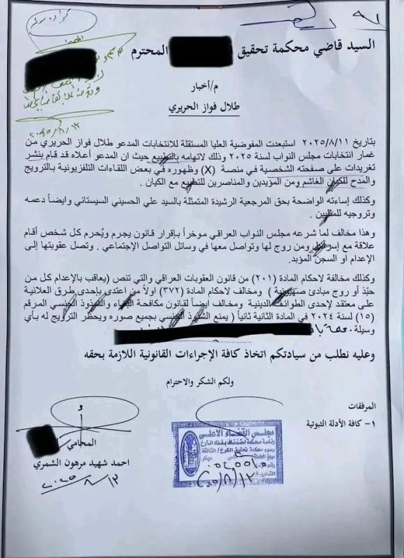 وكتب المحامي احمد شهيد في على حسابه في "الفيس بوك" وتابعته "بغداد اليوم"، أنه "بناءً على الاخبار المقدم من قبلي إلى القضاء، صدور مذكرة قبض وتفتيش بحق طلال الحريري بتهمة الترويج إلى المثلية والكيان الغاشم".