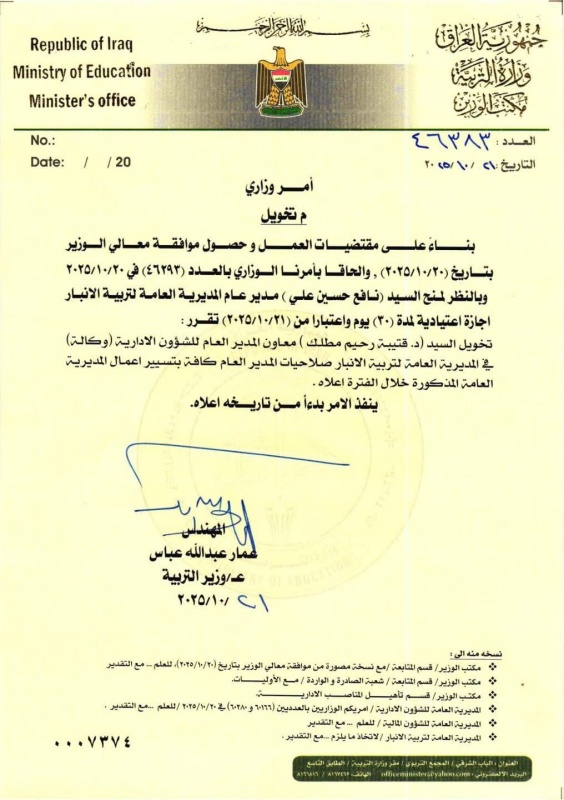 أكدت وزراة التربية، اليوم الثلاثاء (21 تشرين الاول 2025)، تكليف قتيبة العسافي مديرًا لتربية الأنبار بدلاً من نافع الدليمي.