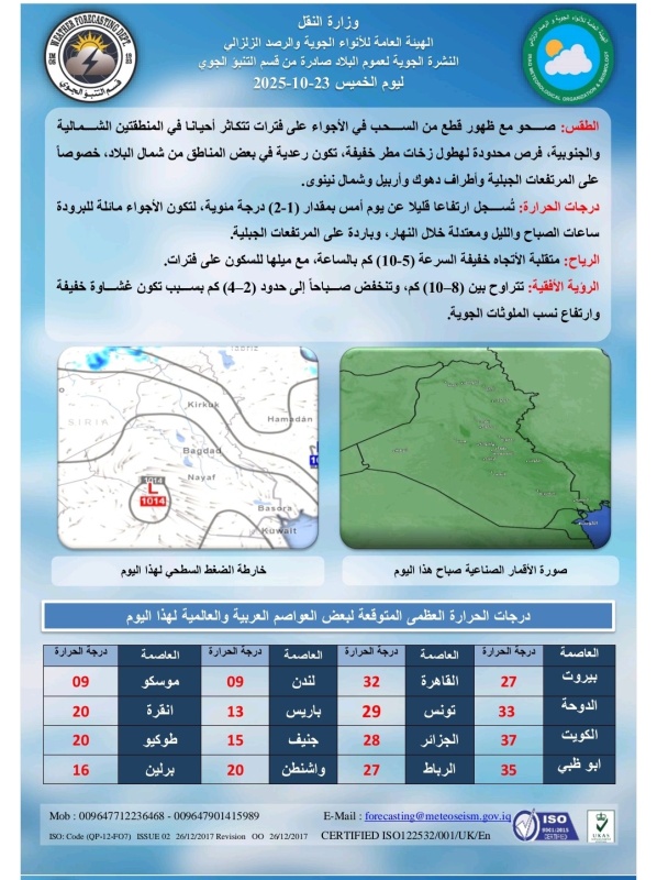 تشير توقعات الطقس في العراق، اليوم الخميس (23 تشرين الاول 2025)، الى أن أجواء البلاد تكون صحوة ترافقها بعض السحب مع فرص محدودة لهطول زخات مطر خفيفة في بعض المناطق من شمال البلاد، فيما ترتفع درجات الحرارة قليلا عن يوم أمس لتكون الأجواء مائلة للبرودة ساعات الصباح والليل ومعتدلة خلال النهار، وباردة على المرتفعات الجبلية.