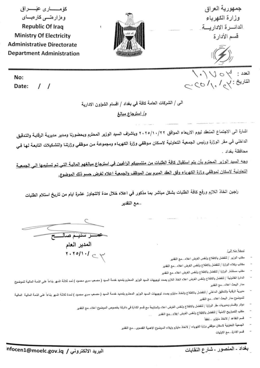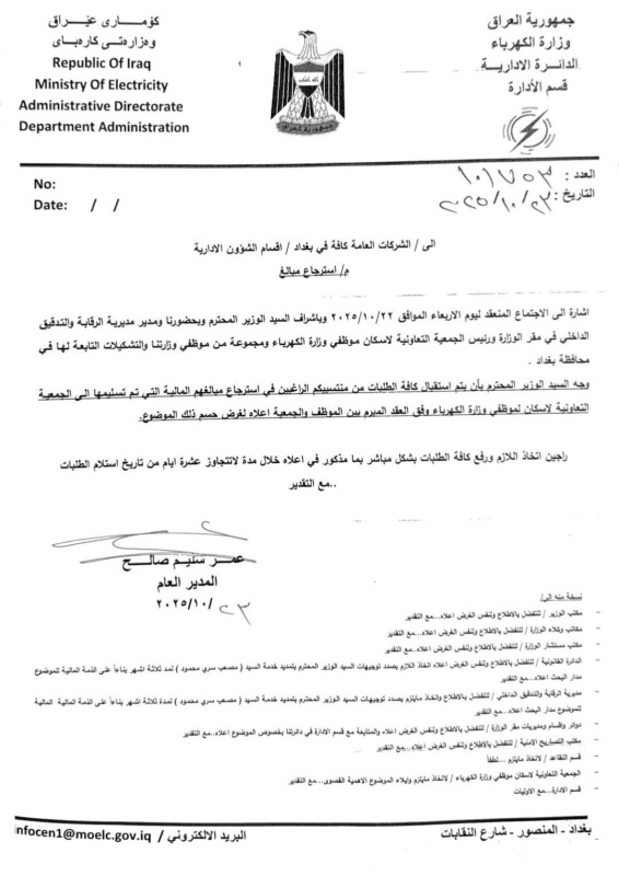 الكتاب الصادر عن الدائرة الإدارية بتاريخ 23 تشرين الأول 2025، والموقّع من المدير العام عمر سليم صالح، أشار إلى أن الاجتماع الذي جرى في اليوم السابق تمّ “بإشراف الوزير وبحضور رئيس الجمعية التعاونية ومجموعة من موظفي الوزارة والمتضررين”، وأن الهدف من الإجراء الجديد هو تسريع عملية استرجاع الأموال وتوثيق الحالات قانونيًا لضمان حق الموظفين.