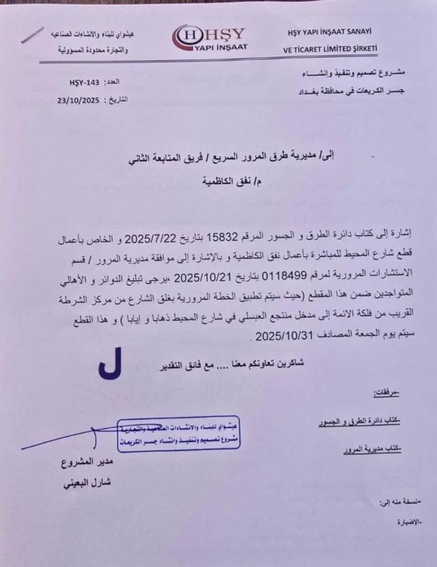 وبحسب وثيقة حصلت عليها "بغداد اليوم"، اليوم السبت (25 تشرين الأول 2025)، فإن "قطع الطريق سيشمل المقطع الممتد من مركز الشرطة القريب من فلكة الأئمة إلى مدخل منتجع العبسلي في شارع المحيط، بالاتجاهين (ذهابًا وإيابًا)".