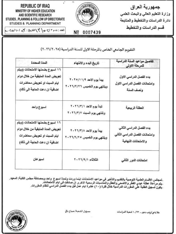 حددت وزارة التعليم العالي والبحث العلمي موعد بدء الفصلِ الدراسي الأول لطلبة المرحلة الأولى.