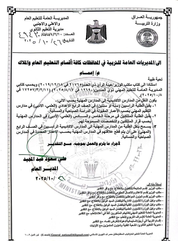 بغداد اليوم- بغداد أعلنت وزارة التربية/ المديرية العامة للتعليم العام والأهلي والأجنبي، اليوم الأحد، (26 تشرين الأول 2025)، عن ضوابط النقل من المدارس الأكاديمية الى المدارس المهنية وبالعكس للعام الدراسي 2025- 2026، وكما موضح أدناه:
