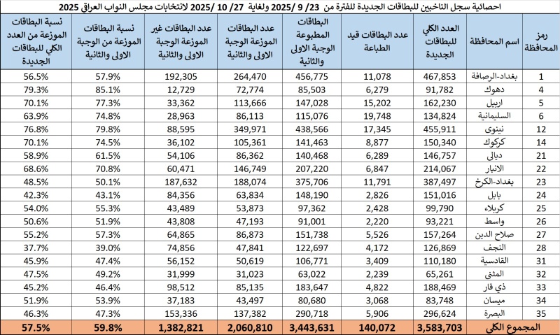 وبحسب وثيقة حصلت عليها "بغداد اليوم"، اليوم الاثنين (27 تشرين الأول 2025)، فإن "أكثر من 1.4 مليون بطاقة ما زالت غير موزعة وغير مطبوعة، وهو ما يعكس حجم التحديات اللوجستية التي تواجه عملية توزيع البطاقات الانتخابية".