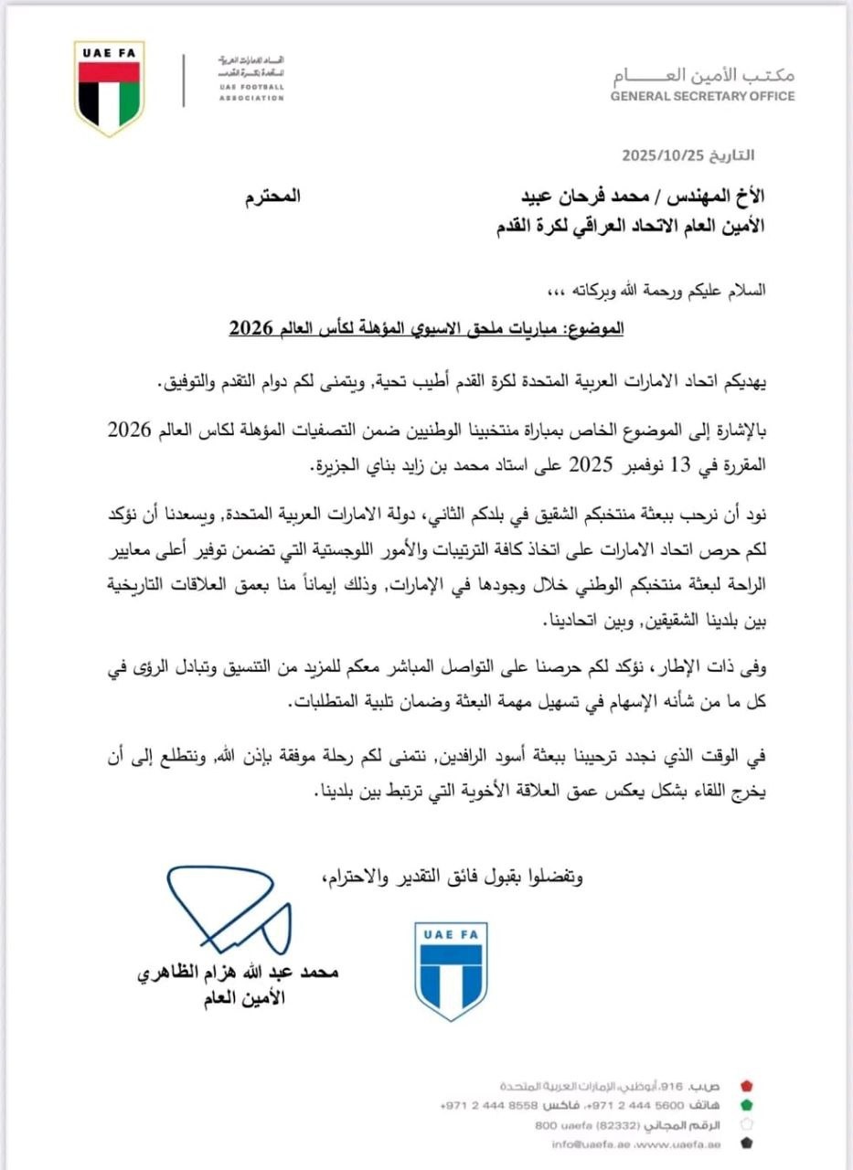 تلقى الاتحاد العراقي لكرة القدم، كتاباً رسمياً من اتحاد الإمارات العربية المتحدة لكرة القدم، أعرب فيه عن ترحيبه ببعثة المنتخب الوطني العراقي قبل المباراة التي ستجمع المنتخبين ضمن التصفيات المؤهلة إلى كأس العالم 2026، والمقررة في 13 تشرين الثاني 2025 على استاد محمد بن زايد في نادي الجزيرة.