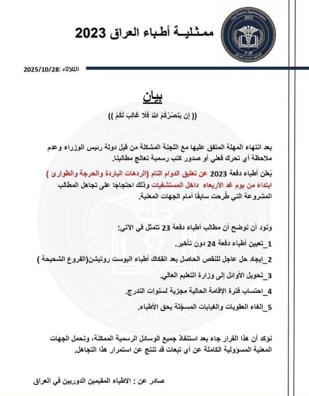 أعلنت ممثلية أطباء العراق دفعة 2023، اليوم الثلاثاء، (28 تشرين الأول 2025)، عن تعليق الدوام التام في المستشفيات احتجاجاً على تجاهل المطالب المشروعة التي طرحت سابقاً.