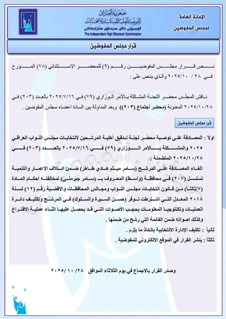 بغداد اليوم - بغداد أعلنت المفوضية العليا المستقلة للانتخابات ، اليوم الثلاثاء (28 تشرين الاول 2025)، استبعاد مرشح حزب الإعمار والتنمية سامر جيرمني عن محافظة واسط من السباق الانتخابي. ادناه نص الوثيقة :
