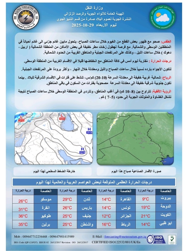 تشير توقعات الطقس في العراق، اليوم الأربعاء (29 تشرين الاول 2025)، الى أن أجواء البلاد تكون صحوة مع ظهور بعض القطع من الغيوم خلال ساعات الصباح في المنطقتين الوسطى والشمالية، مع فرصة لهطول زخات مطر خفيفة في بعض الأماكن من المنطقة الشمالية، فيما تنخفض درجات الحرارة في الاقسام الغربية من المنطقة الوسطى.