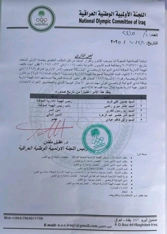 وذكرت وثيقة صادرة من اللجنة بتاريخ (28 تشرين الأول 2025)، وحصلت "بغداد اليوم" على نسخة منها انه "استناداً للصلاحية المخولة لنا بموجب القانون وللقرار المتخذ من قبل المكتب التنفيذي بجلسته الأولى المنعقدة بتاريخ 11-2-2025 ومطالعة قسم الشؤون القانونية بالعدد (1005) في 23-10-2025 تقرر انهاء تكليف الهيئة الادارية المؤقتة لنادي الديوانية الرياضي المشكلة بموجب الأمر الاداري المرقم (1/1492) في 28-7-2025 لانتهاء المدة القانونية الممنوحة للهيئة الإدارية واستناداً لاحكام المادة (14) اولا) من قانون الأندية الرياضية رقم (18) لسنة 1986 المعدل تقرر تعيين السادة المدرجة اسمائهم الناه كهيئة إدارية مؤقتة لنادي الديوانية الرياضي تتولى مهام تسيير الأعمال اليومية للنادي والتحضير لإجراء الانتخابات الاختيار هيئة ادارية جديدة خلال مدة أقصاها ثلاثة اشهر".