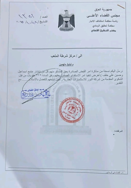أظهرت وثيقة متداولة صادرة عن مجلس القضاء الأعلى في محافظة الأنبار، حصلت عليها "بغداد اليوم"، اليوم الخميس (30 تشرين الأول 2025)، صدور أمر قبض بحق مدير هيئة استثمار الأنبار والمرشح عن حزب تقدم بشار العامج، وذلك على خلفية شكوى مقدمة من شركة النور للاستشارات العقارية.