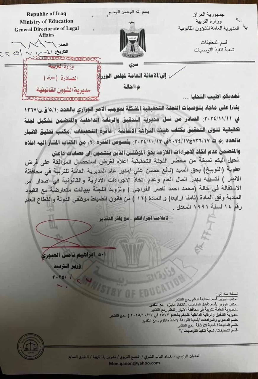 أظهرت وثيقة صارة عن وزارة التربية، حصلت عليها "بغداد اليوم"، اليوم الجمعة (31 تشرين الأول 2025)، أن وزير التربية وجّه عقوبة التوبيخ بحق مدير عام تربية الأنبار نافع الدليمي المحسوب على حزب تقدم، وذلك على خلفية صرف رواتب لقياديين في تنظيم داعش.